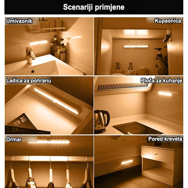 Zalijepite ga blizu vrata kupaonice ili unutar kupaonice. Aktivira se kada se približite, pružajući dovoljno svjetla za noćne posjete bez jake svjetline stropnih svjetala.